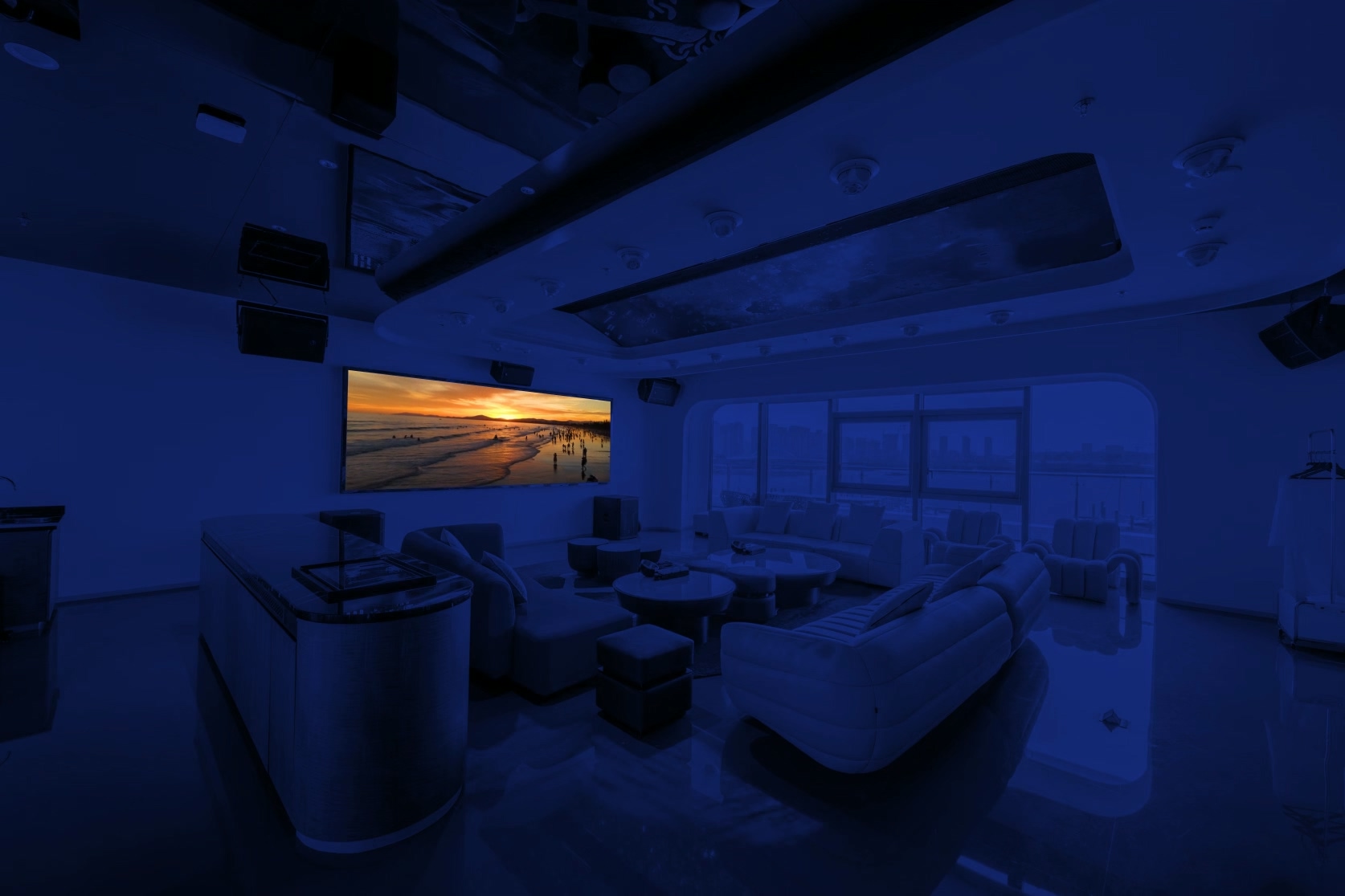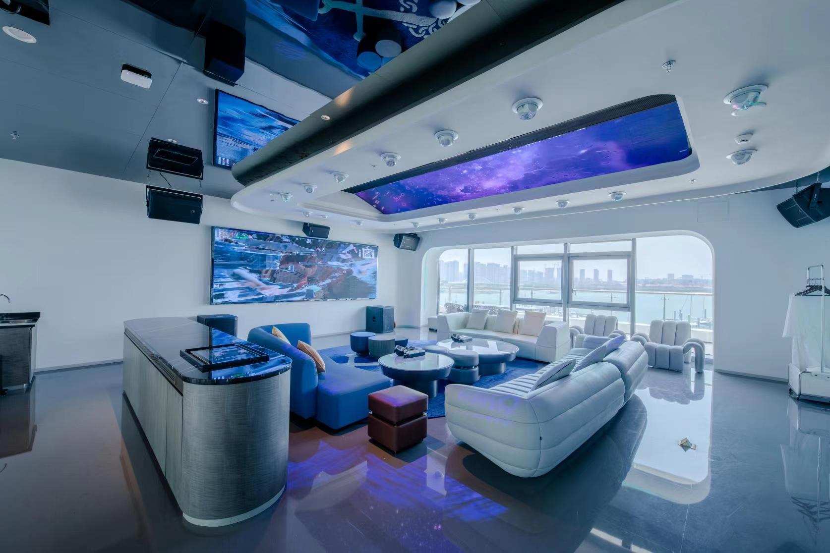 In a futuristic yacht club, where cars and dolphins blend reality and virtuality, modern technology enables a wondrous dialogue between marine creatures and mechanical creations, outlining the luxurious and romantic aspects empowered by technology within the yacht club. Every detail speaks of the infinite possibilities of future life.